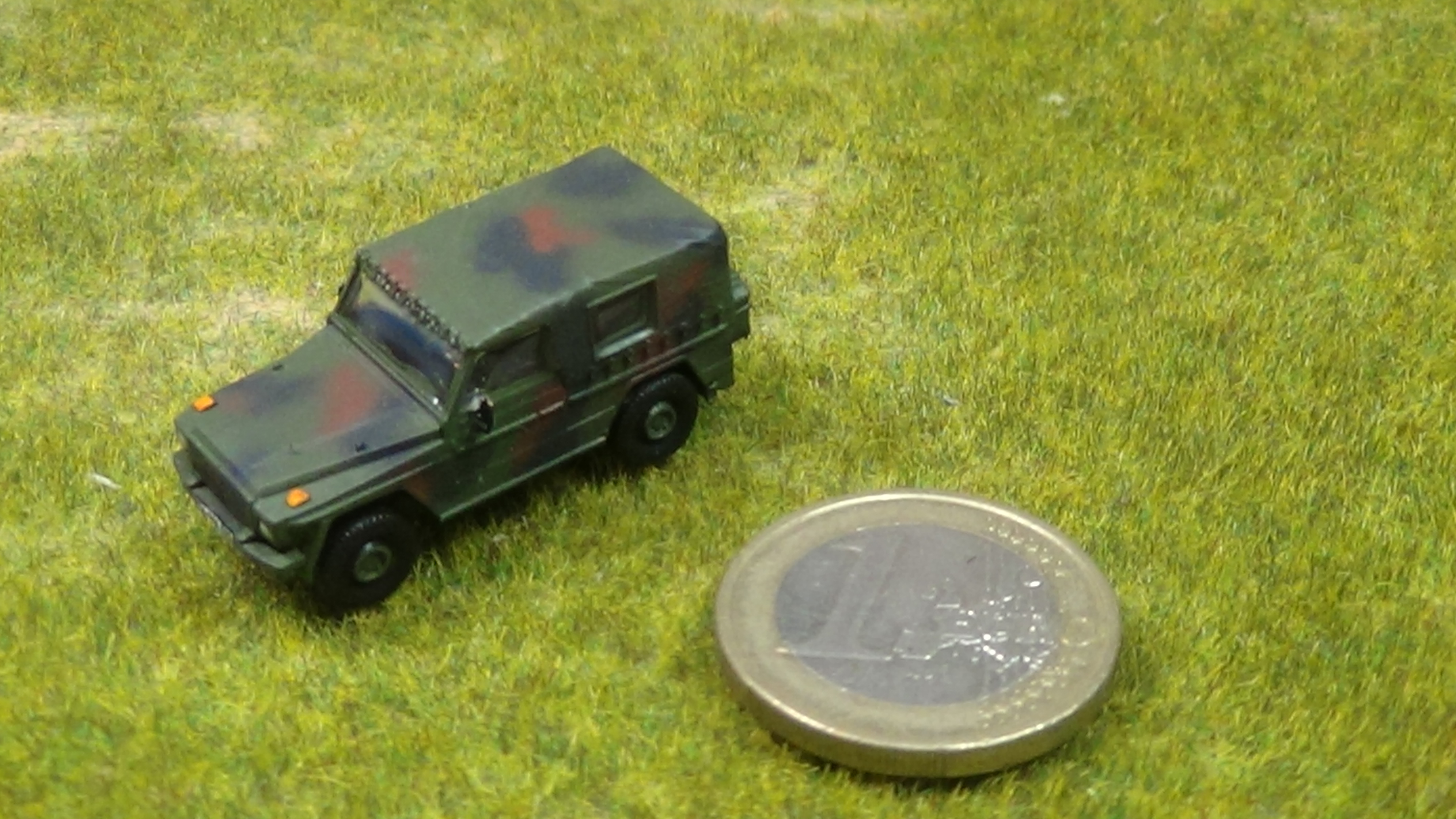 Sankra Bundeswehr in Dreifarbtarnung mit Y - Kennzeichen , taktischen Zeichen im Maßsdtab 1/120. Zur Demonstration neben € - Münze fotografiert