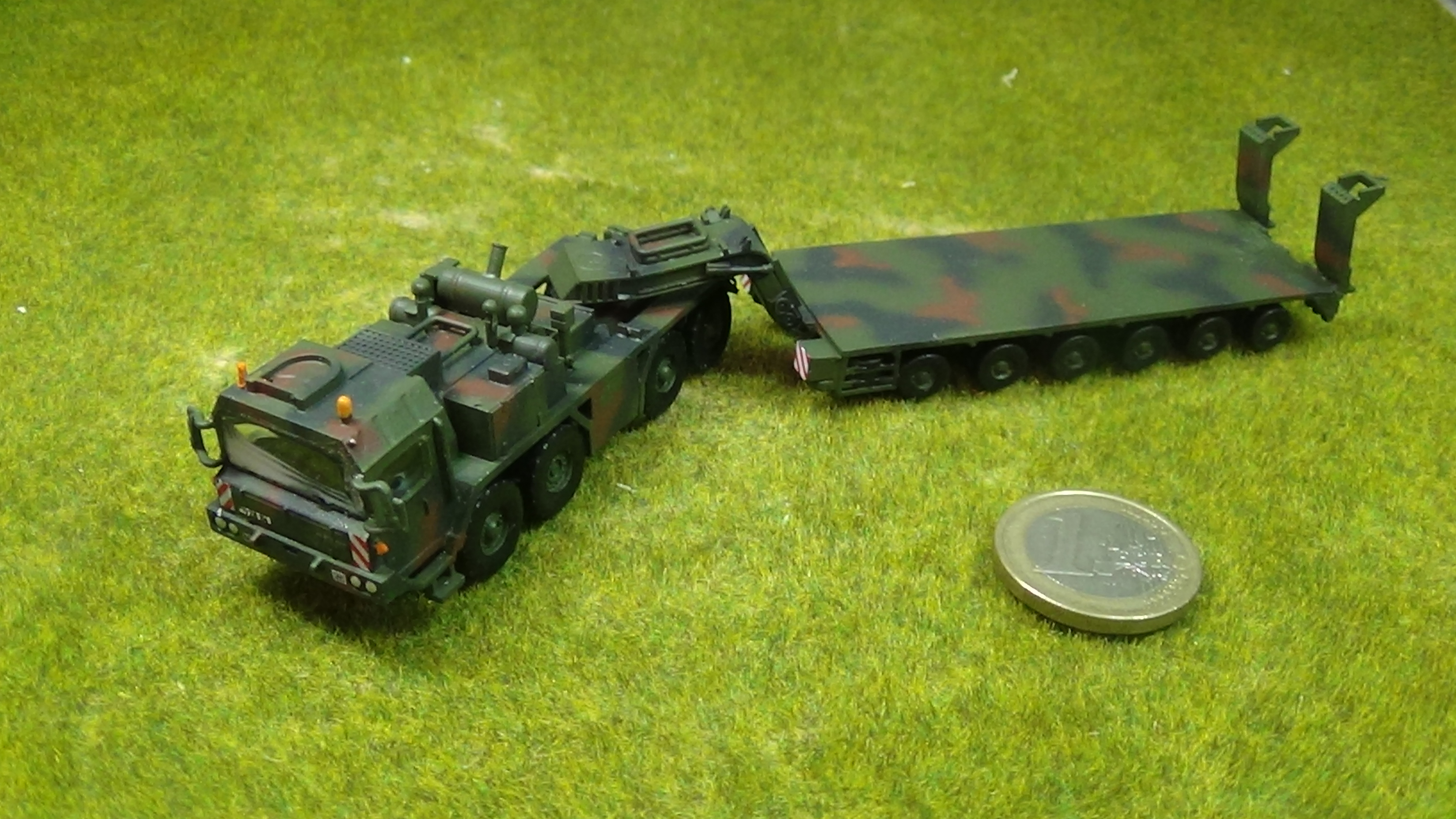 Modell einer Panzertransporters mit Trailer der Bundeswehr. Ich fertige Ihnen ein gleiches Modell gerne bei Auftrag an. Euro dient dem Größenvergleich !