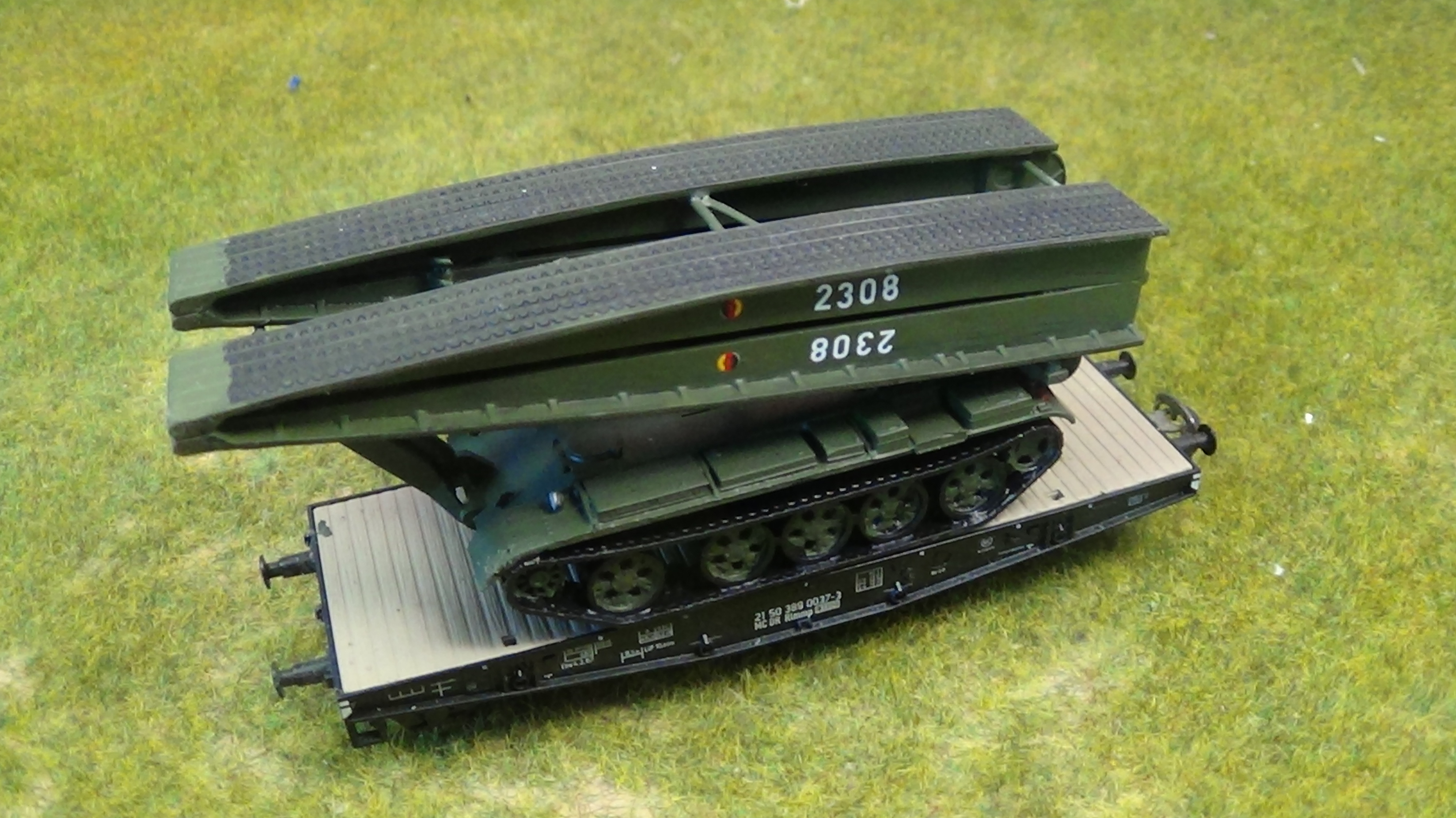 Brückenleger BLG 60 auf T 55 mit abnehmbarer Brücke im Maßstab 1/120 zur Demonstration auf TT Waggon fotografiert.