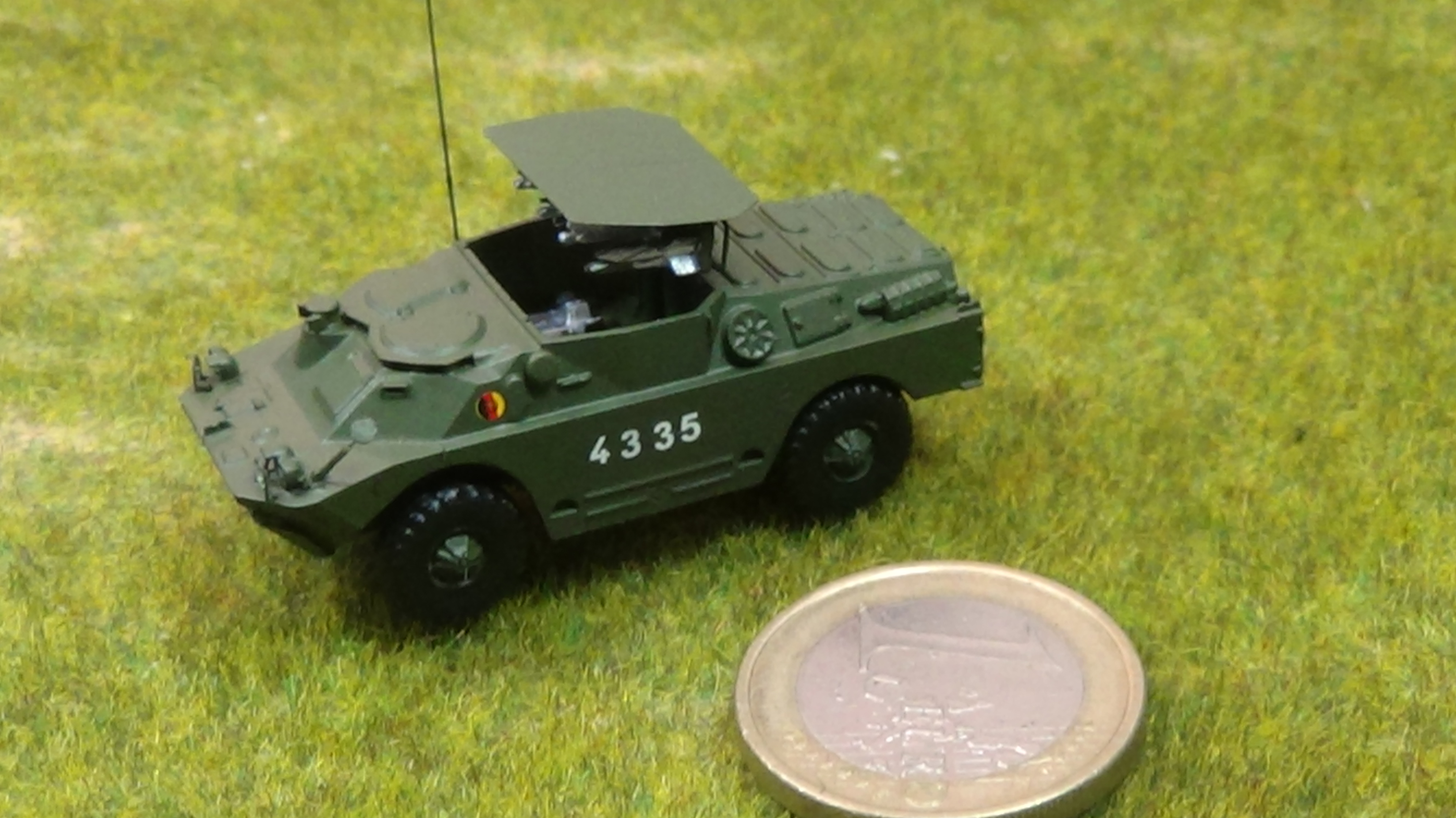 Modell eines SPW 70 im Maßstab 1/120 zur Demonstration neben einem Euro fotografiert.