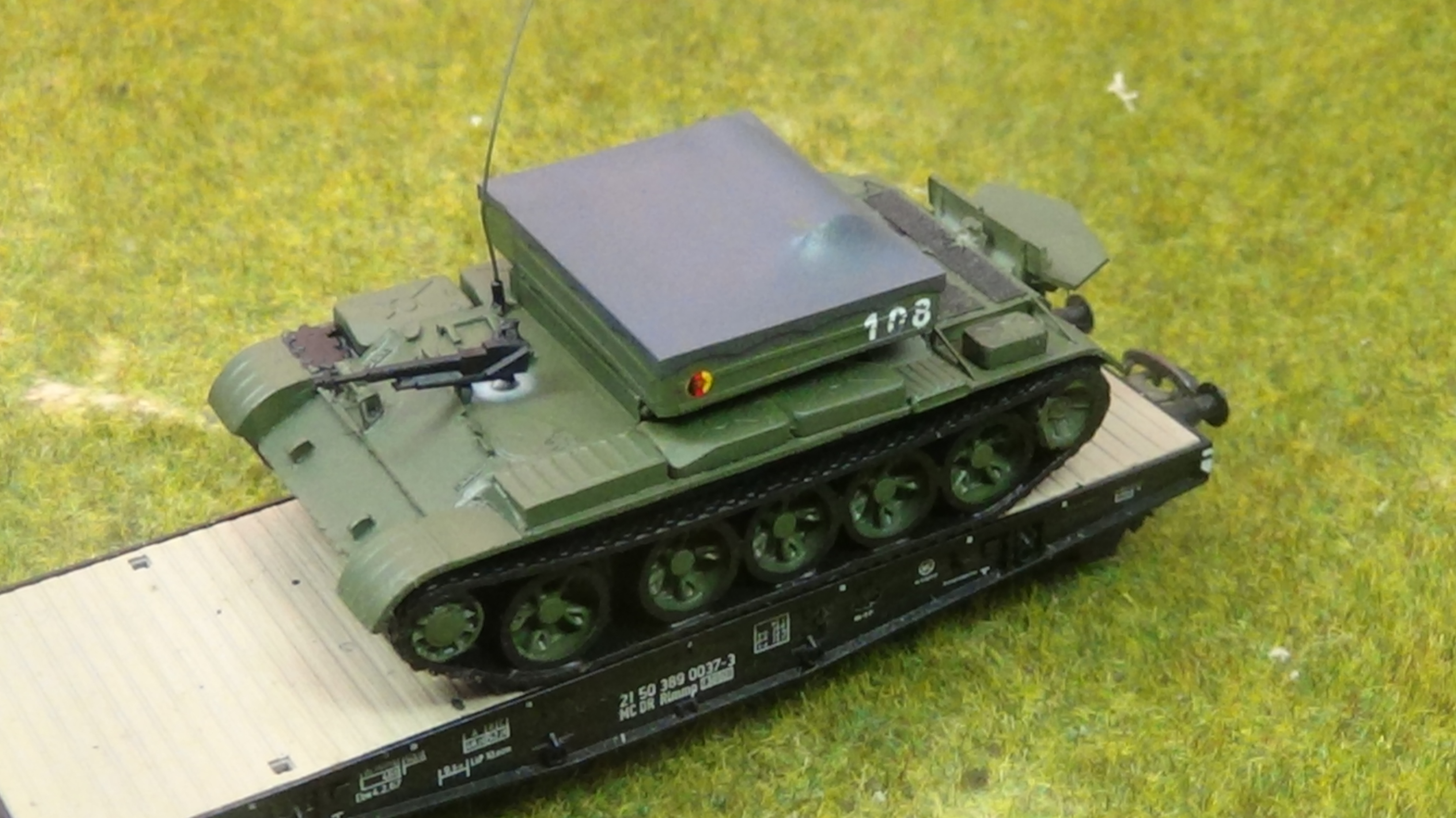 Bergepanzermodell T 55 TK im Maßstab 1/120 fotografiert zur Demonstration auf einem TT - Waggon.