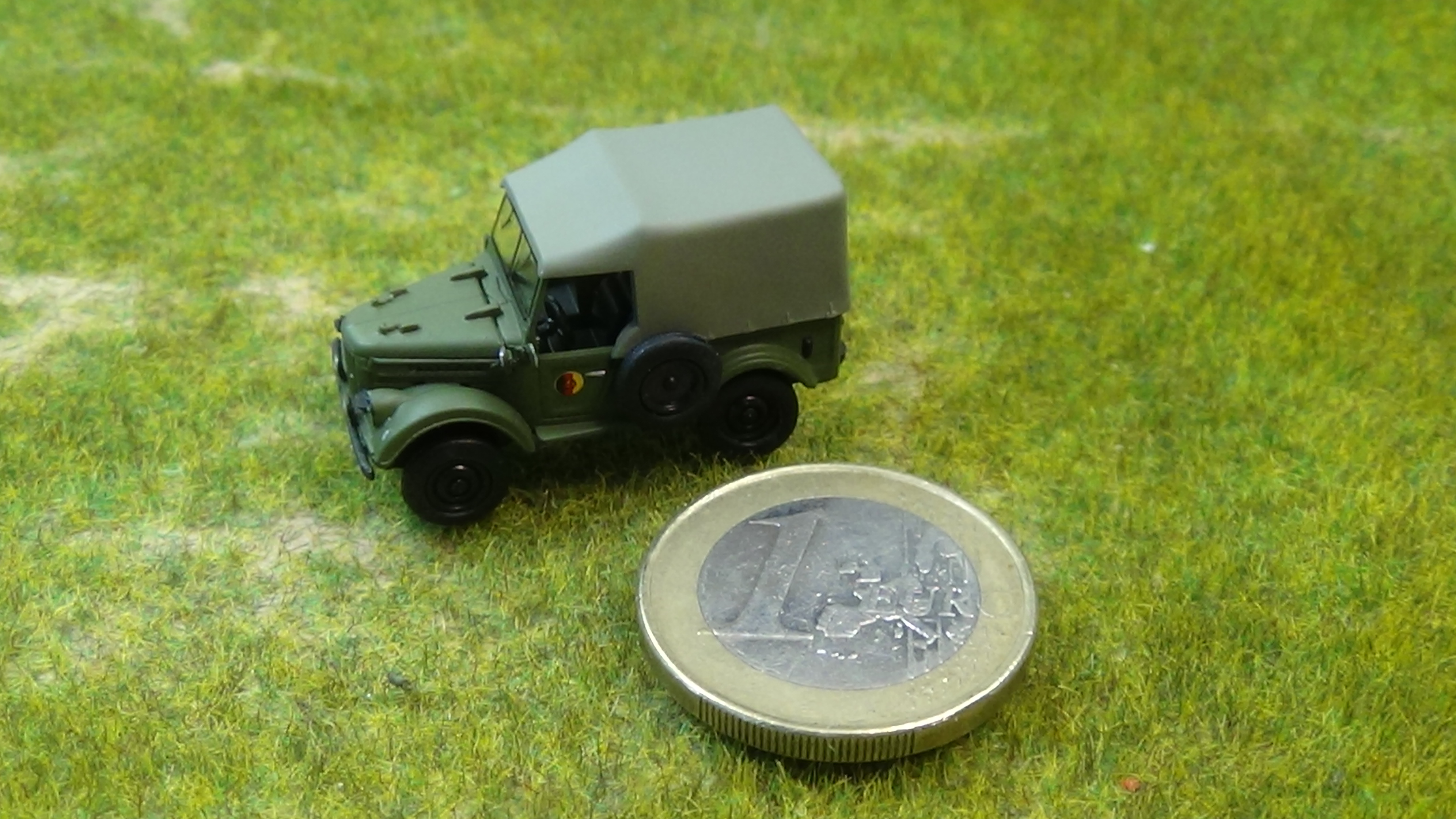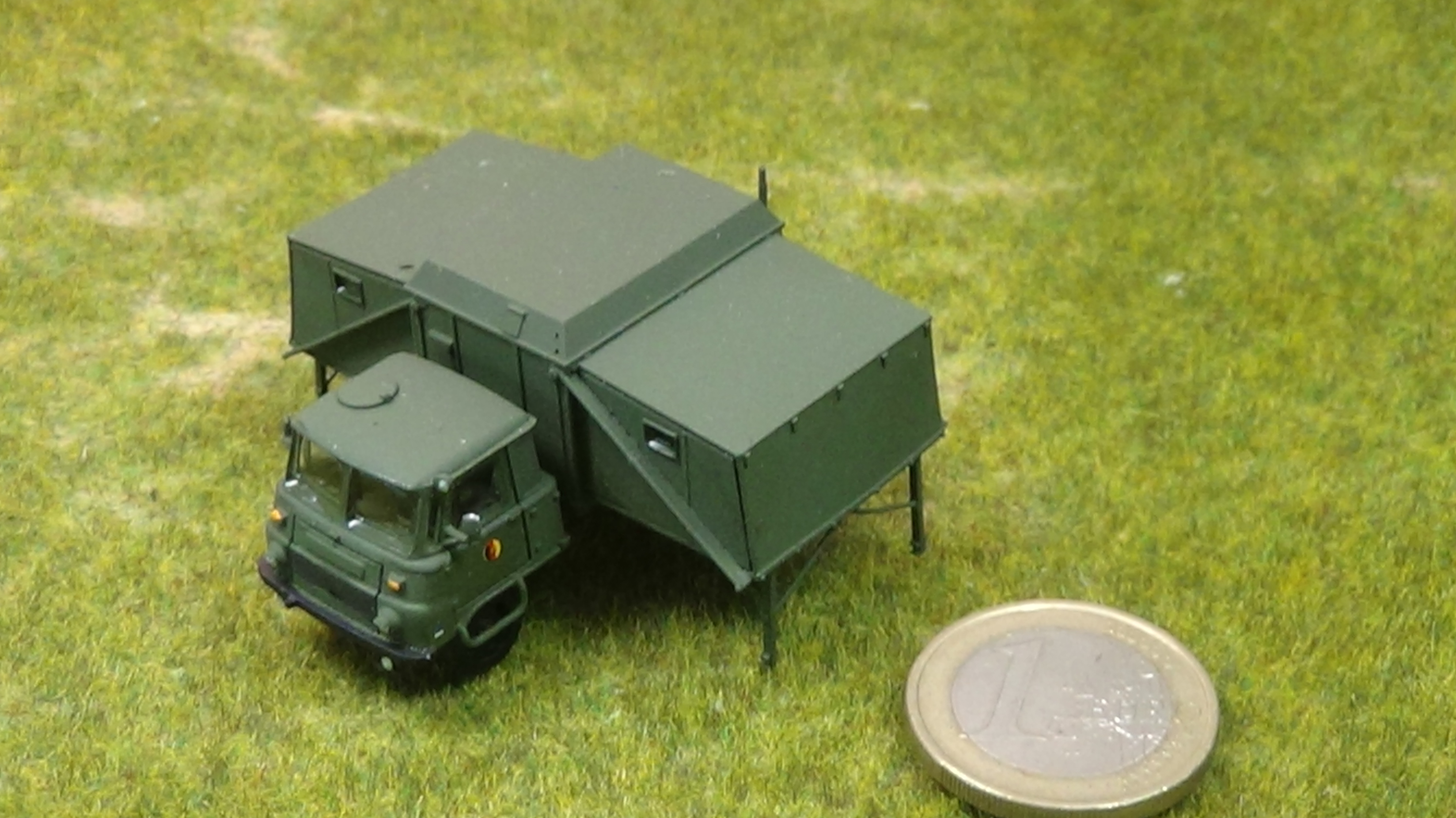 LO Robur Stabsfahrzeug entfaltet im Maßstab 1/120 zur Demonstration neben einem Euro fotografiert.