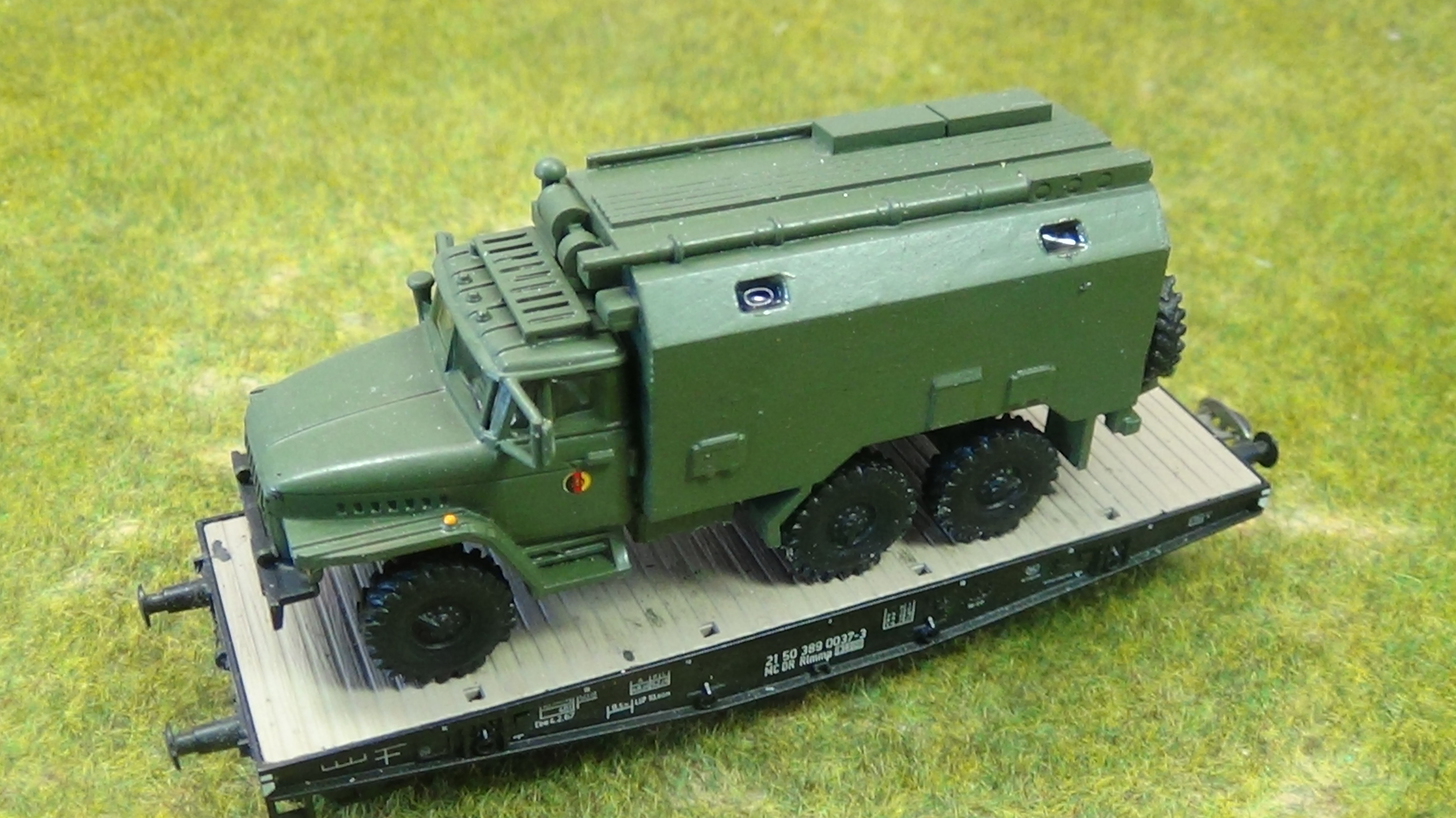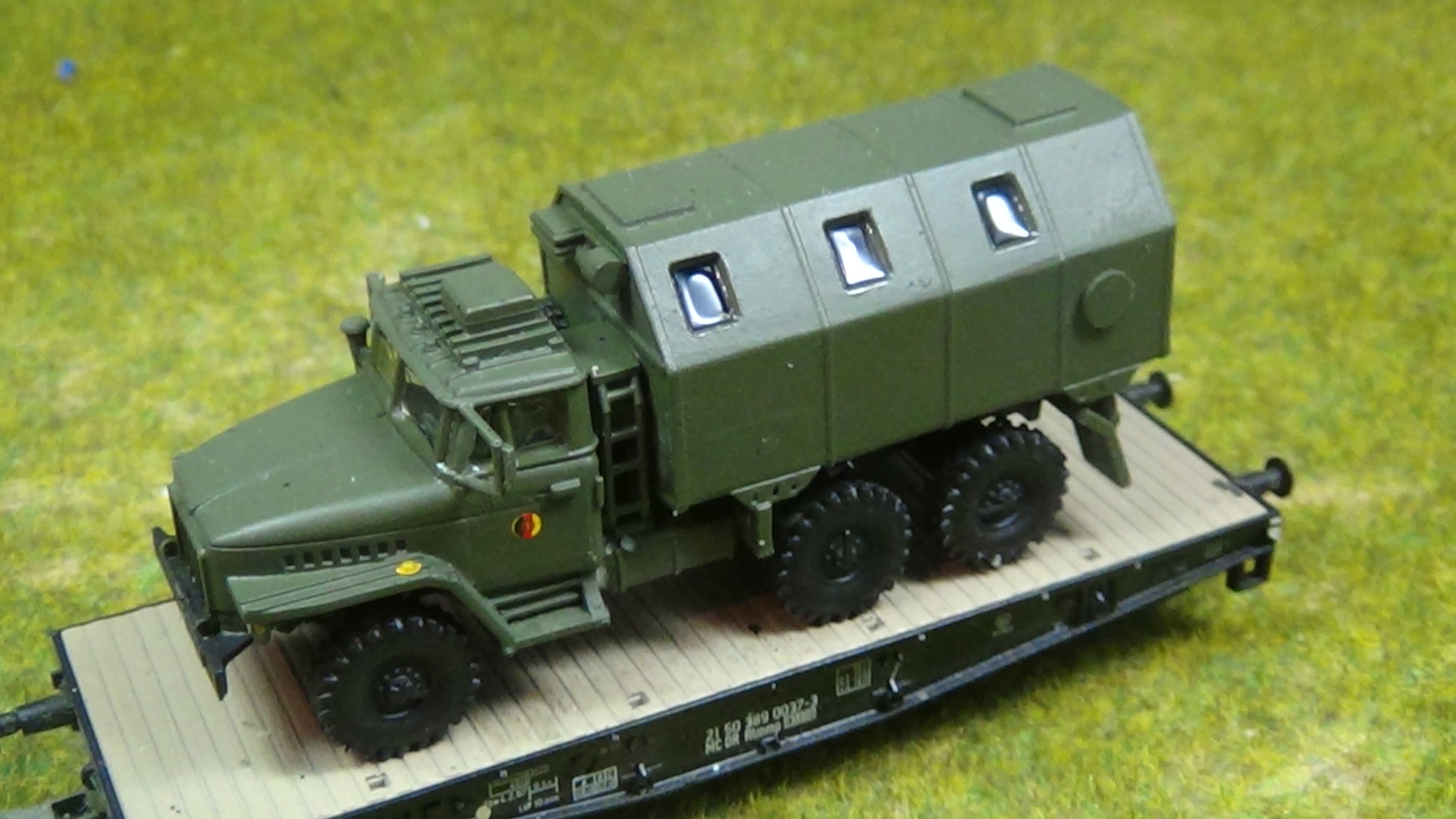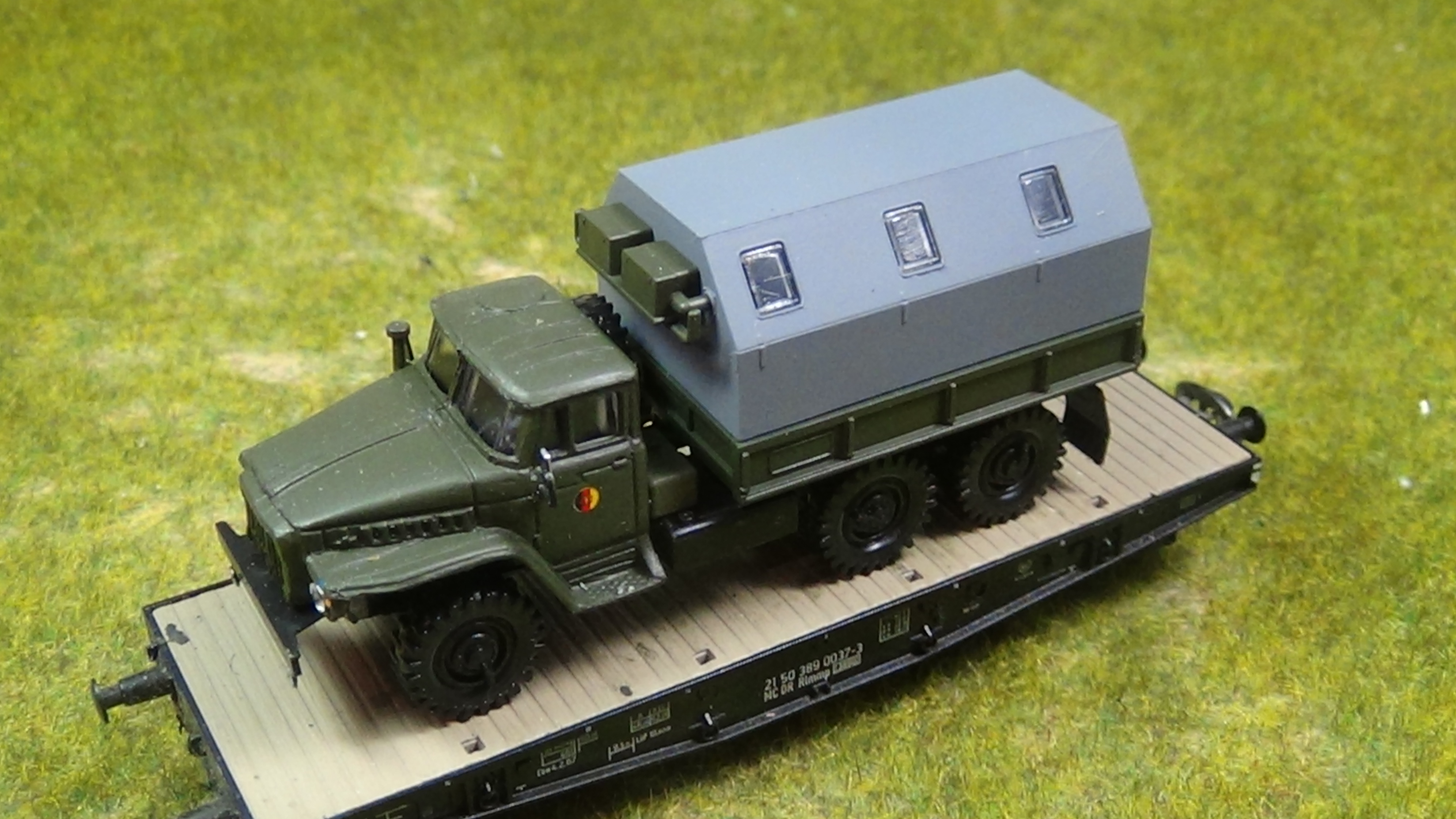 Werkstattwagen Ural 375 D mit Panzer, Wartungs - und Instandsetztungseinrichtung im Maßstab 1/120, TT . Euro dient der Größendemonstration.
