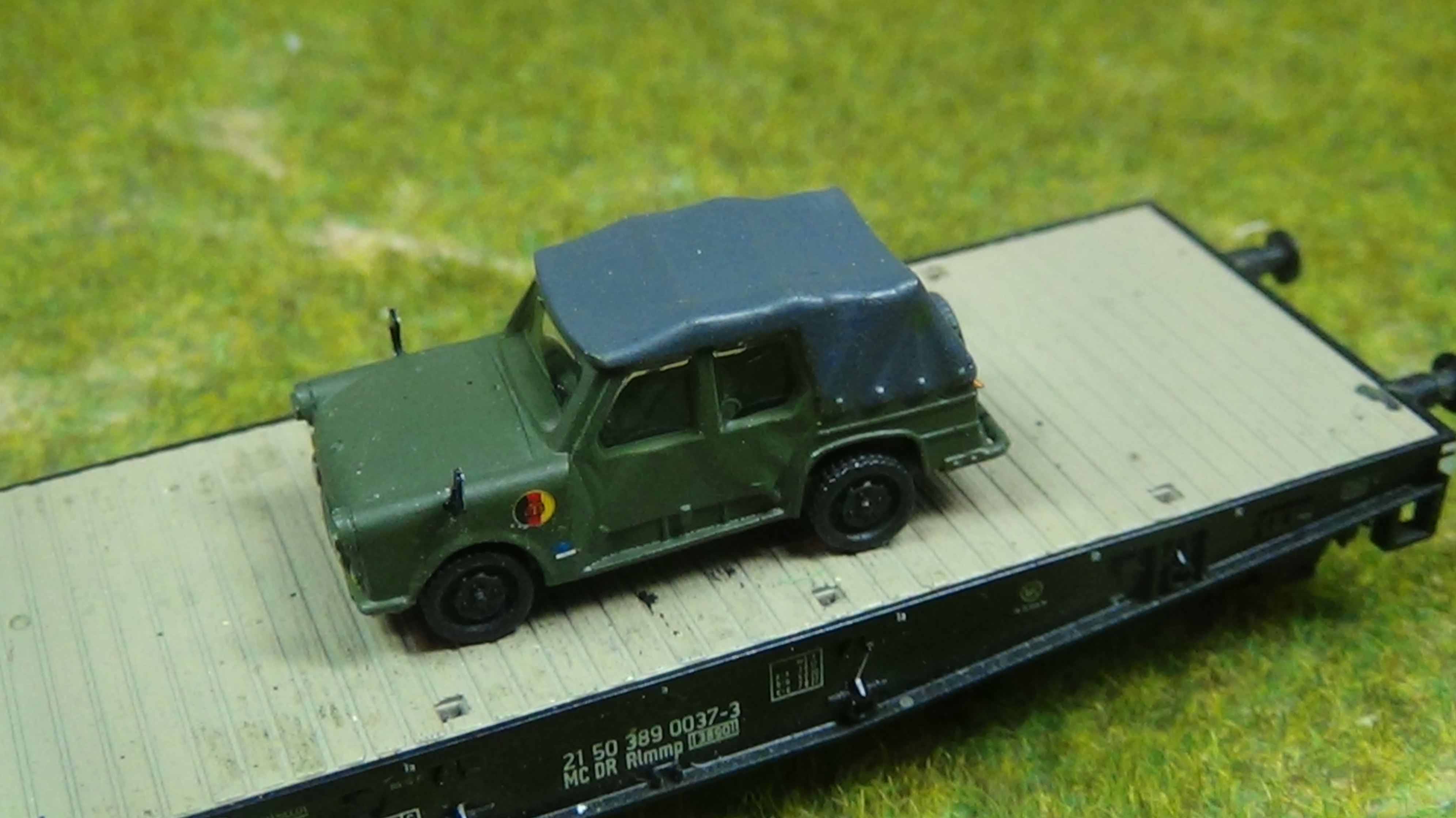 Trabant Kübel P 601 Stoffhund zur Demonstration auf TT - Waggon fotografiert.