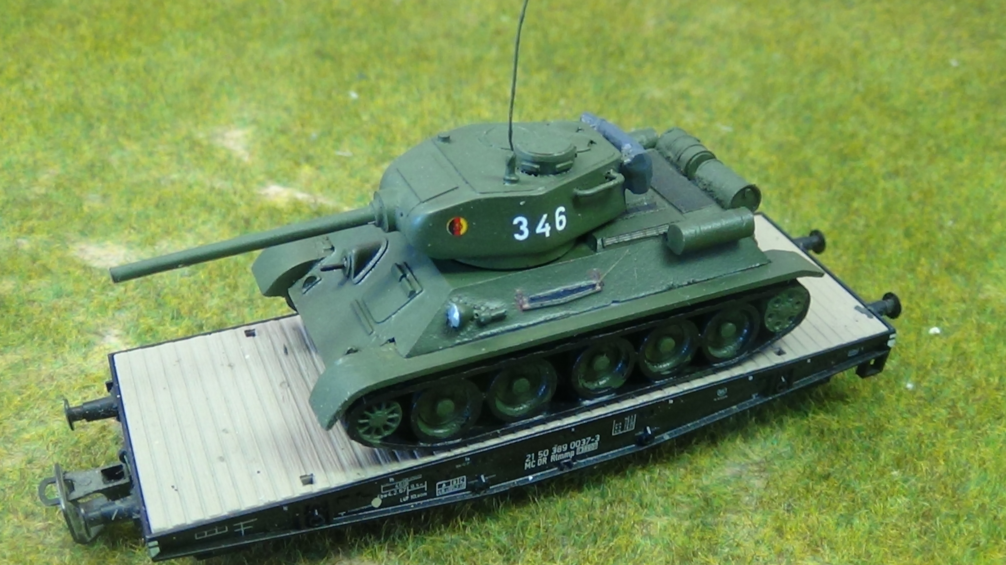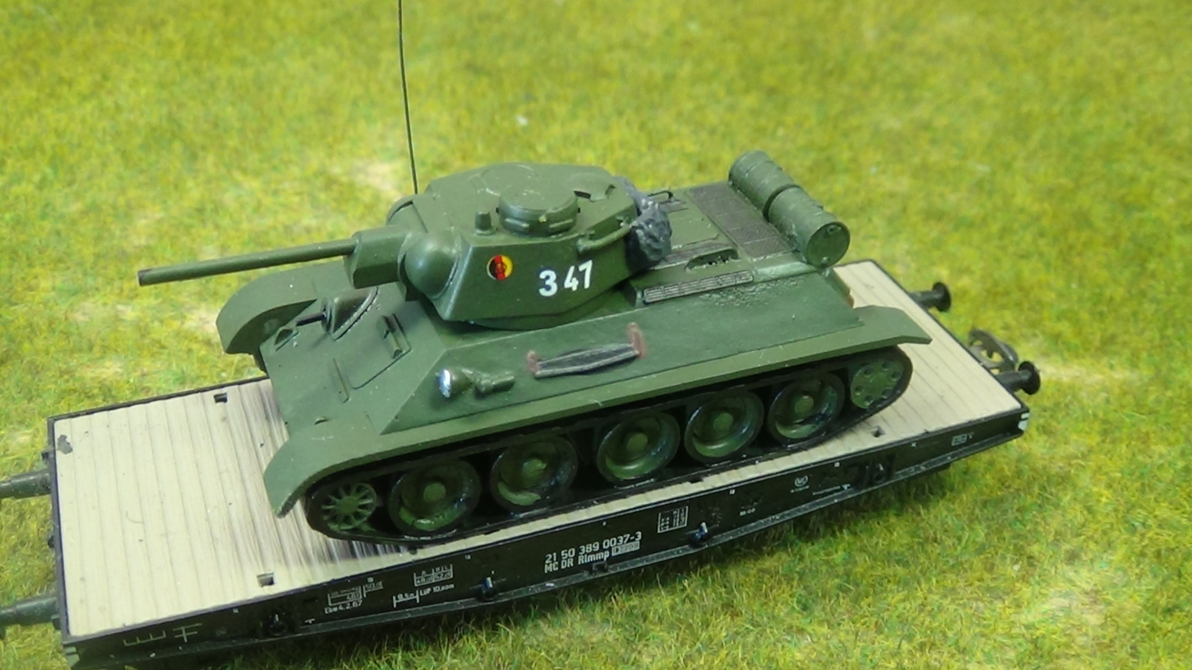 T 34 / 76 im Maßstab 1/120 TT auf ROCO Schwerlastwaggon fotografiert.