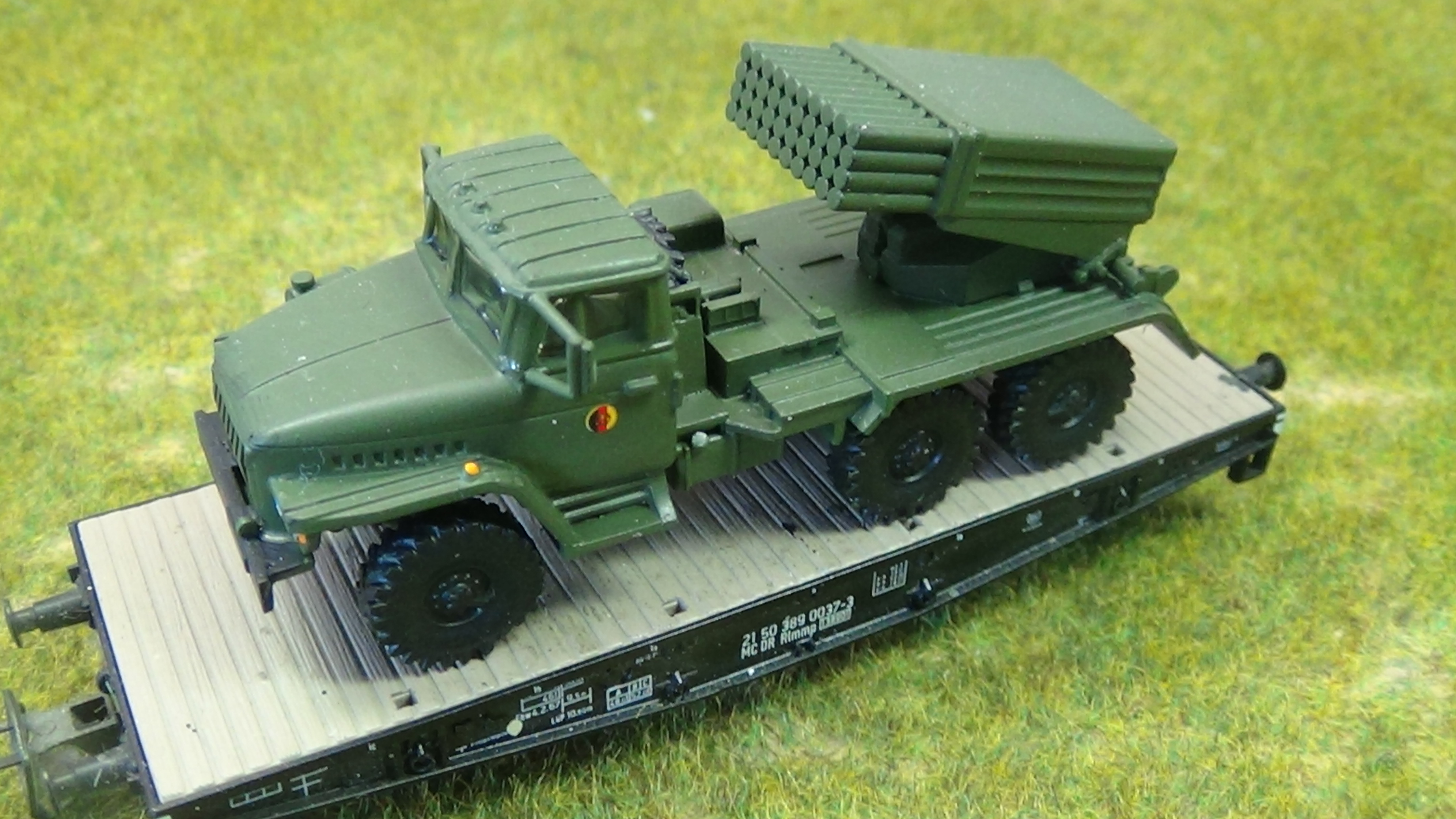 Gestaltetes 3 D Druckmodell eines Geschosswerfers RM -70 der NVA im Maßstab 1/120. Zur Demonstration auf TT - Waggon fotografiert.