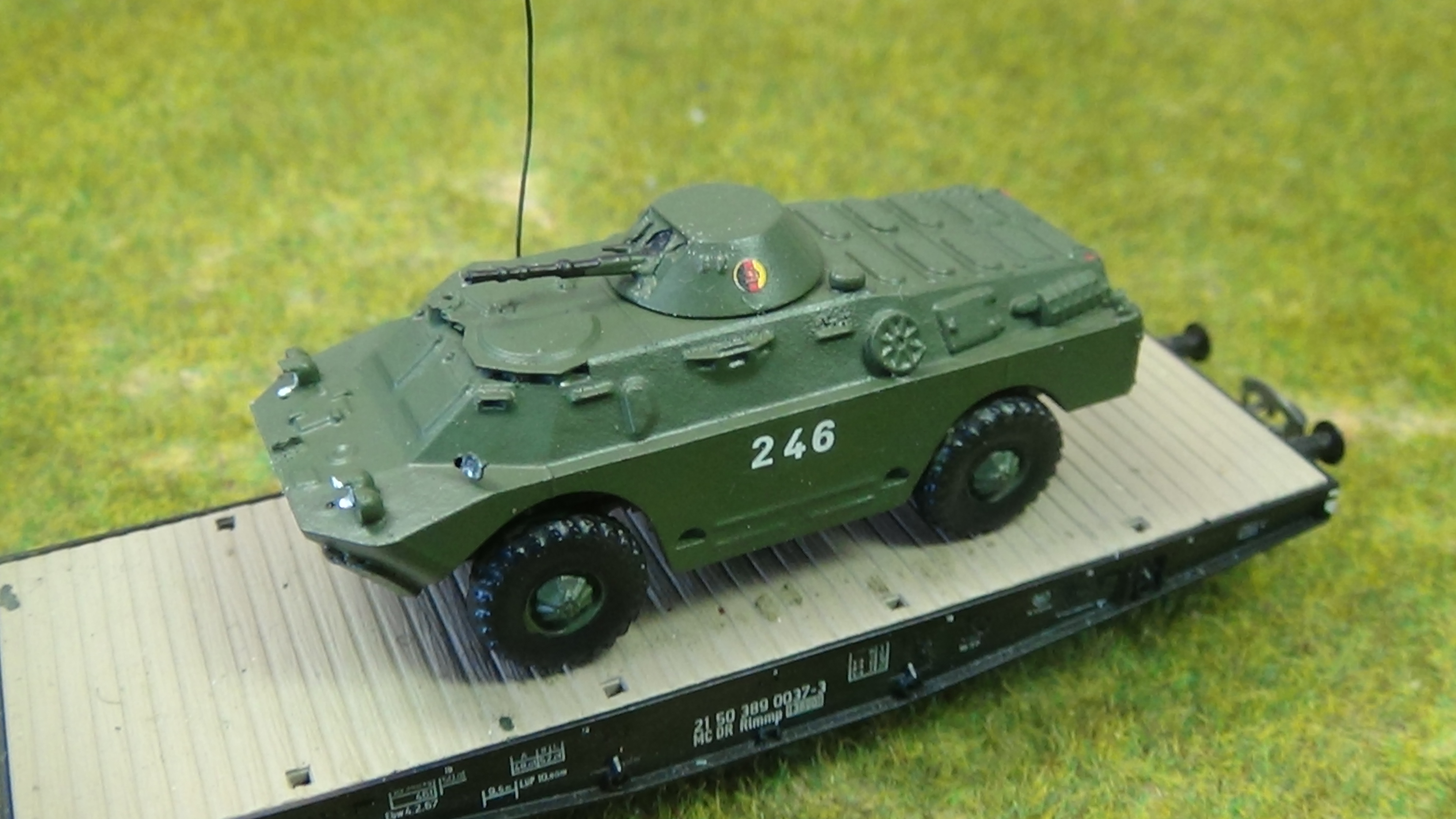 Resinmodell eines Spz 60 PB Funkausführung mit vielen Messingätzteilen in Ausführung NVA / DDR zur Veranschaulichung auf einem TT Waggon fotografiert.