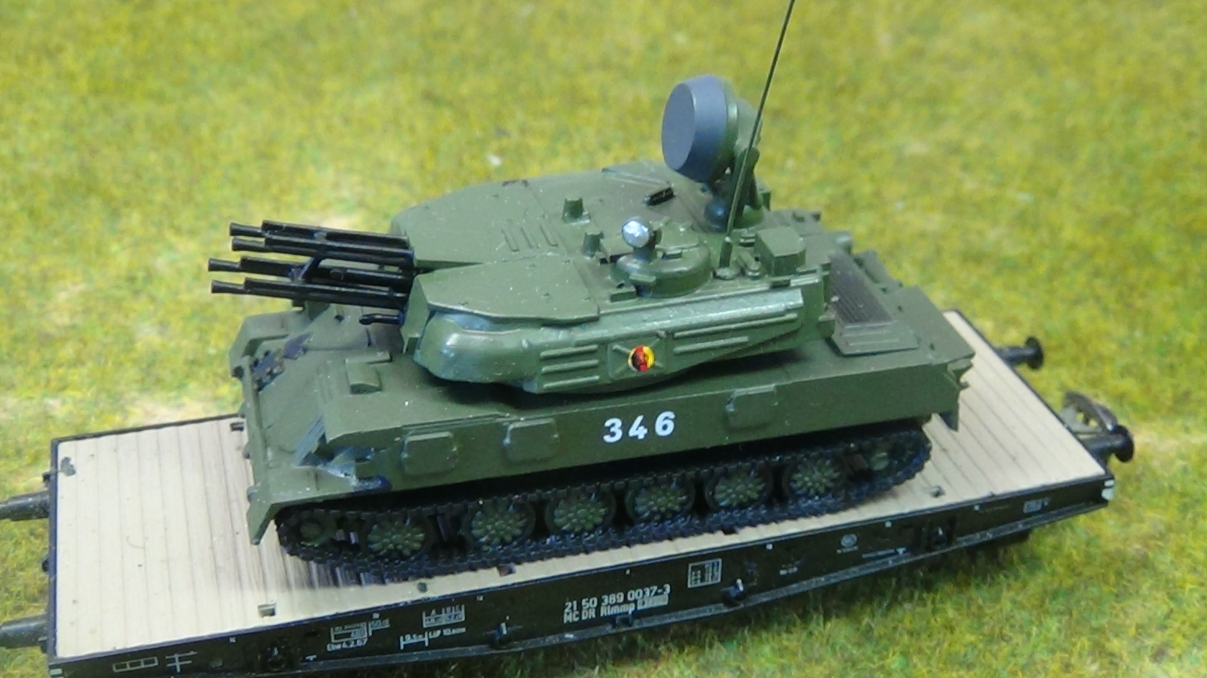 Modell einer Fla SFL 23/4 Schilka im Maßstab 1 : 120, das in ein NVA Modell umgearbeitet wurde. Zur Demonstration auf TT - Waggon fotografiert.
