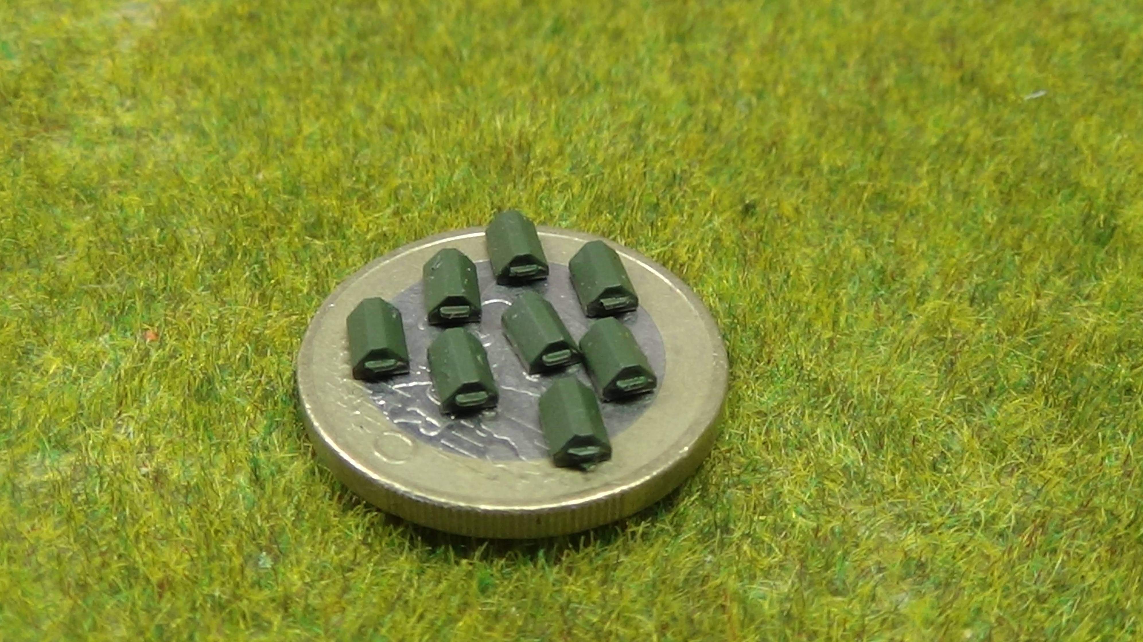 Selbstgestaltete Feldküche / Gulaschkanone im Maßstab 1/120 aus 3 D Druckmodell gestaltet. Mit weißen Ecken und lesbarem VA - Kennzeichen. TT - Waggon dient dem Größenvergleich.