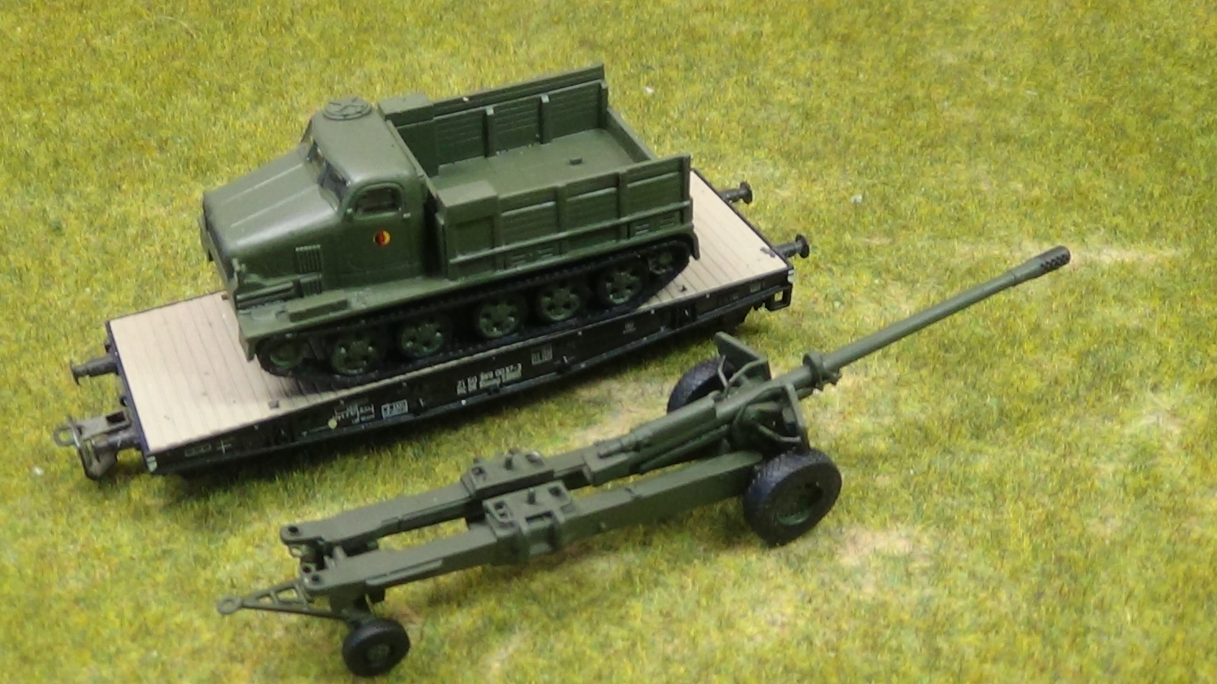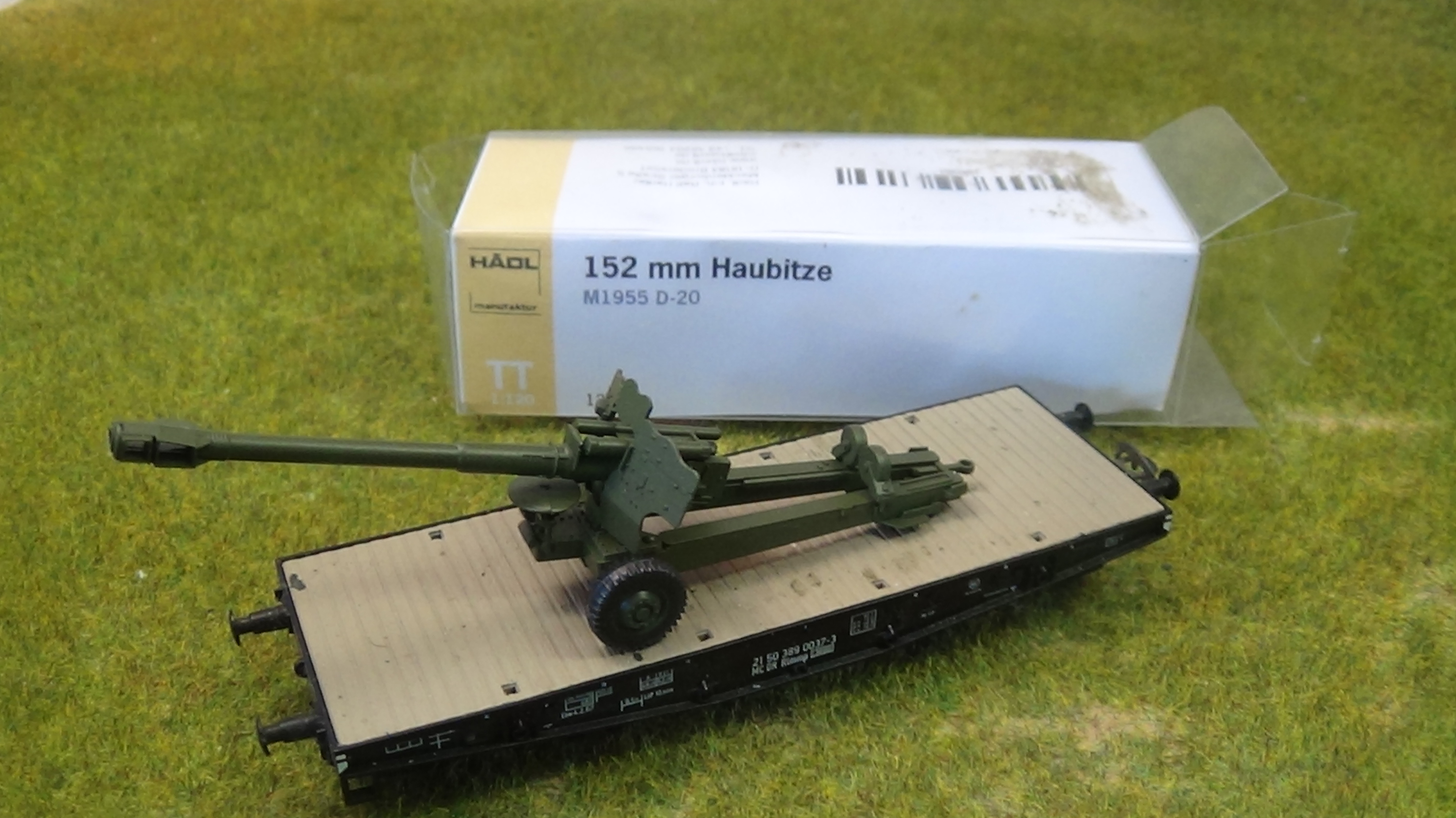 Original Hädl - Modell einer 152 mm Haubitze der NVA im Maßstab 17120; TT in OVP. TT Waggon dient nur dem Größenvergleich.