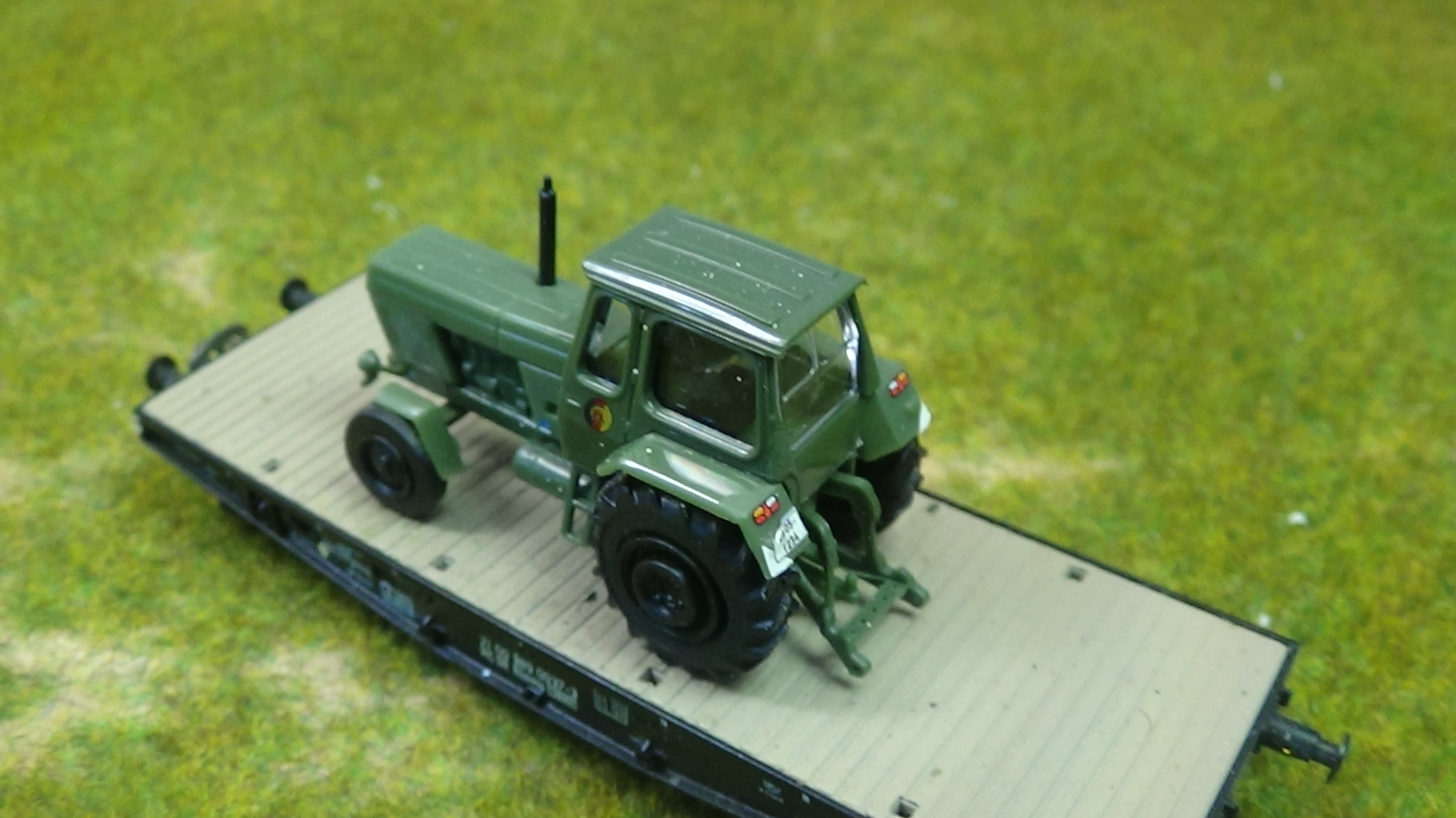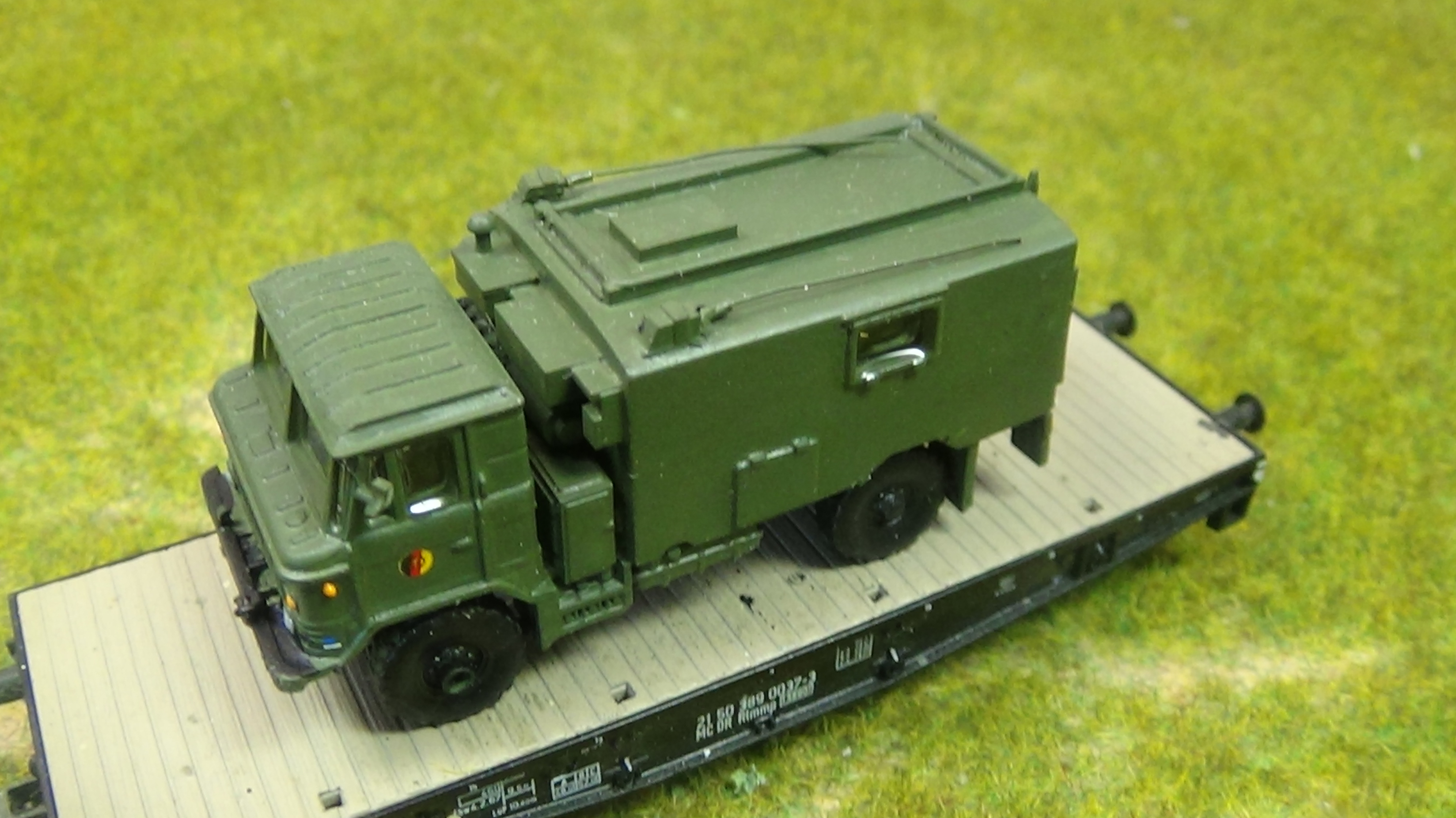 Modell eines Tarta 815 ohne Schiebeschild im Maßstab 1/120 in Farbgebung der NVA der DDR. TT Waggon dient dem Größenvergleich.