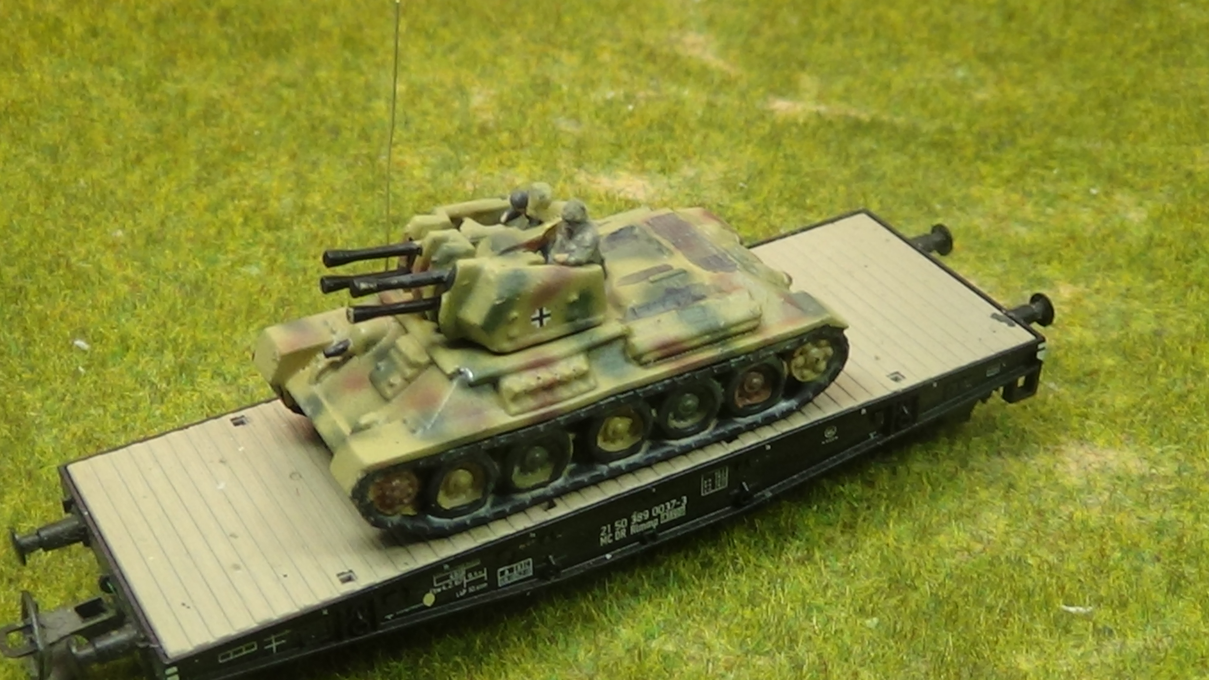 Selbstgestaltetes Modell eines T 34 Beutepanzers mit 4 x 2 cm Flak der Wehrmacht im Maßstab 1/144. Zur Demonstration auf einem TT - Waggon verladen.