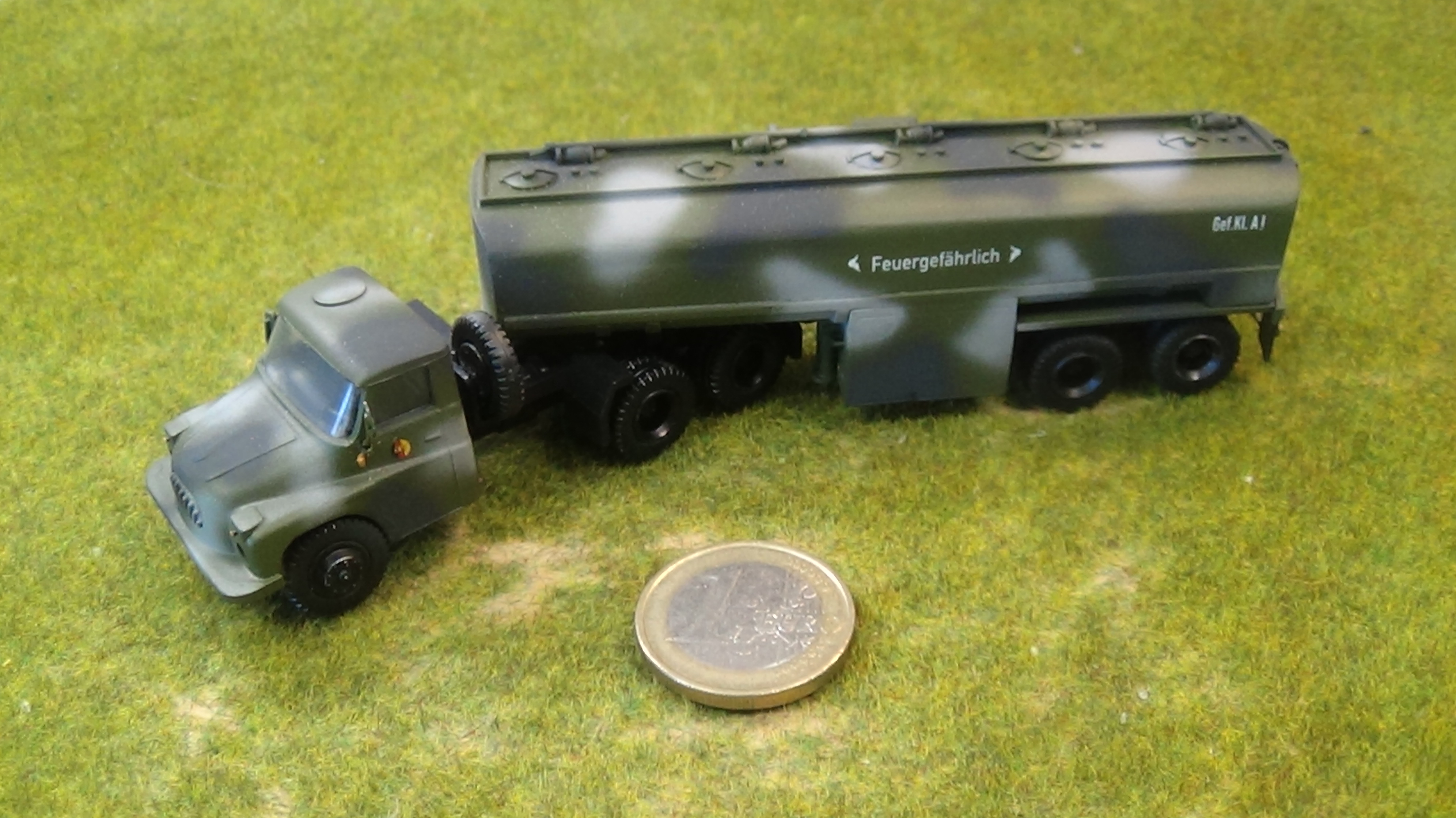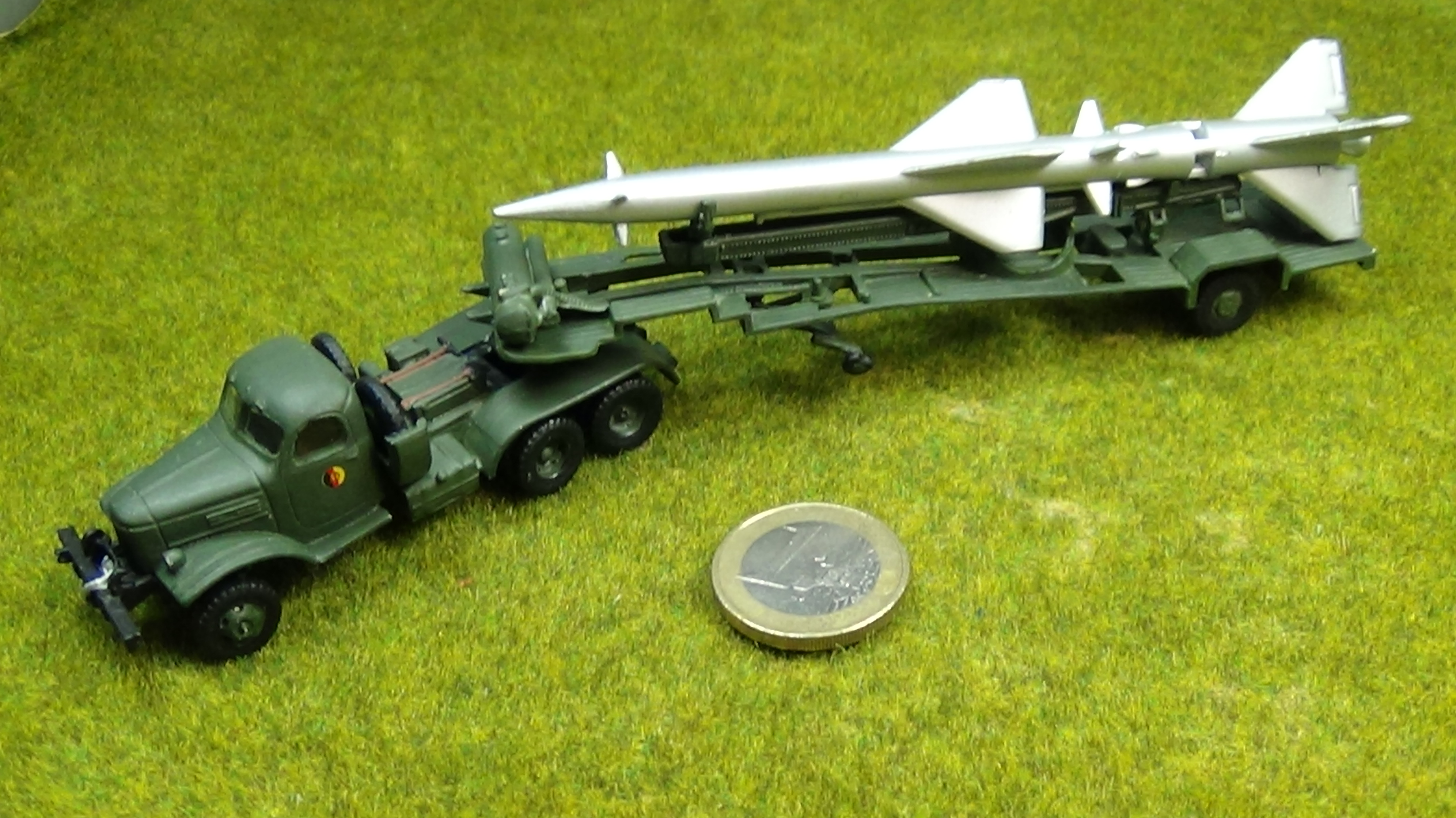 Modell eines Sil 157 Raketentransporters der mit Airbrush gestaltet wurde. Kpl. Modell inkl. Sattelstütze, Druckkessel, Haltegabel Rakete, Ersatzrädern + Halterung. Superung durch DDR - Decals, NVA Kennzeichen, Tiefwatzeichen, weiße Ecken. Einzelstück !