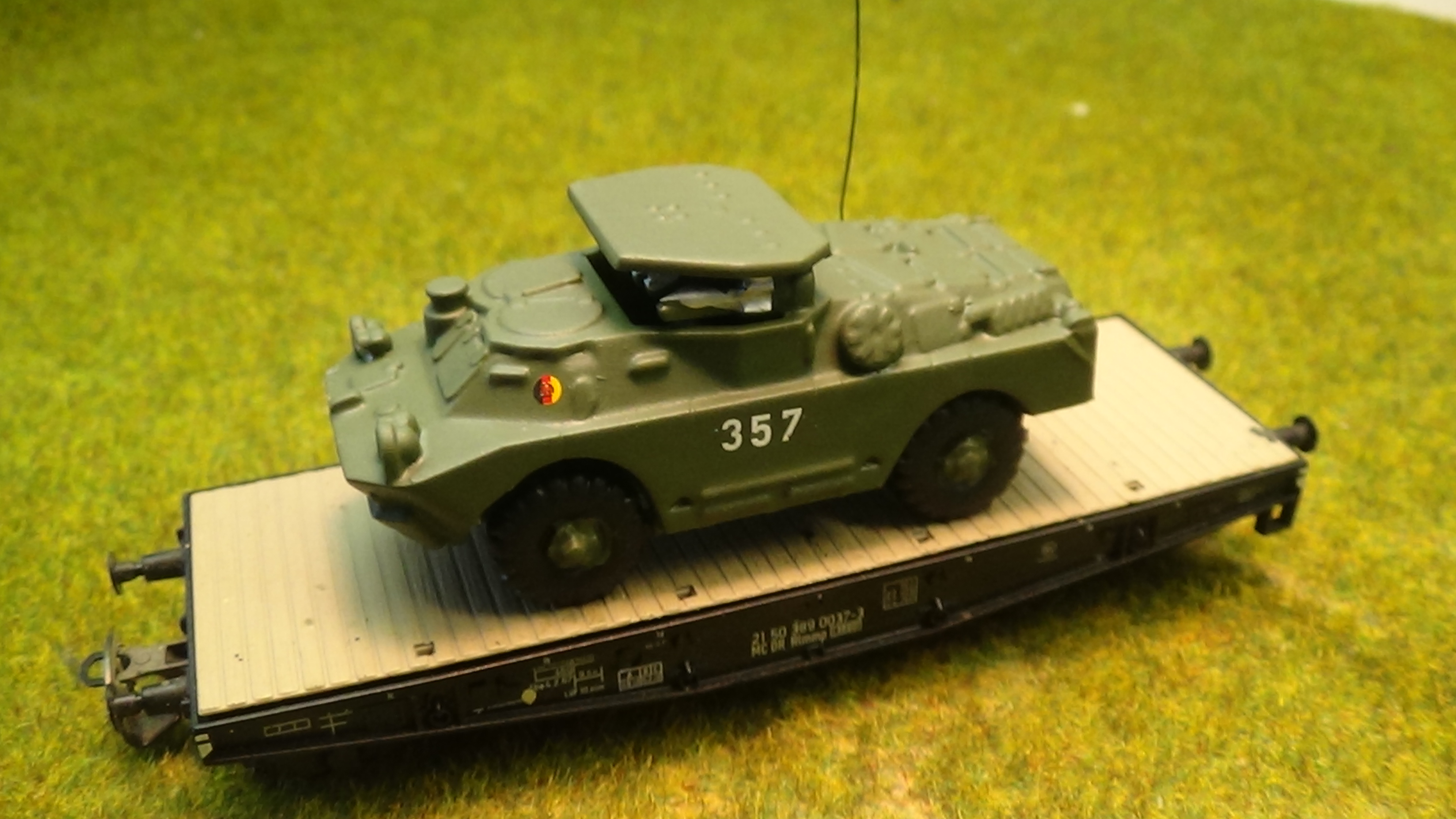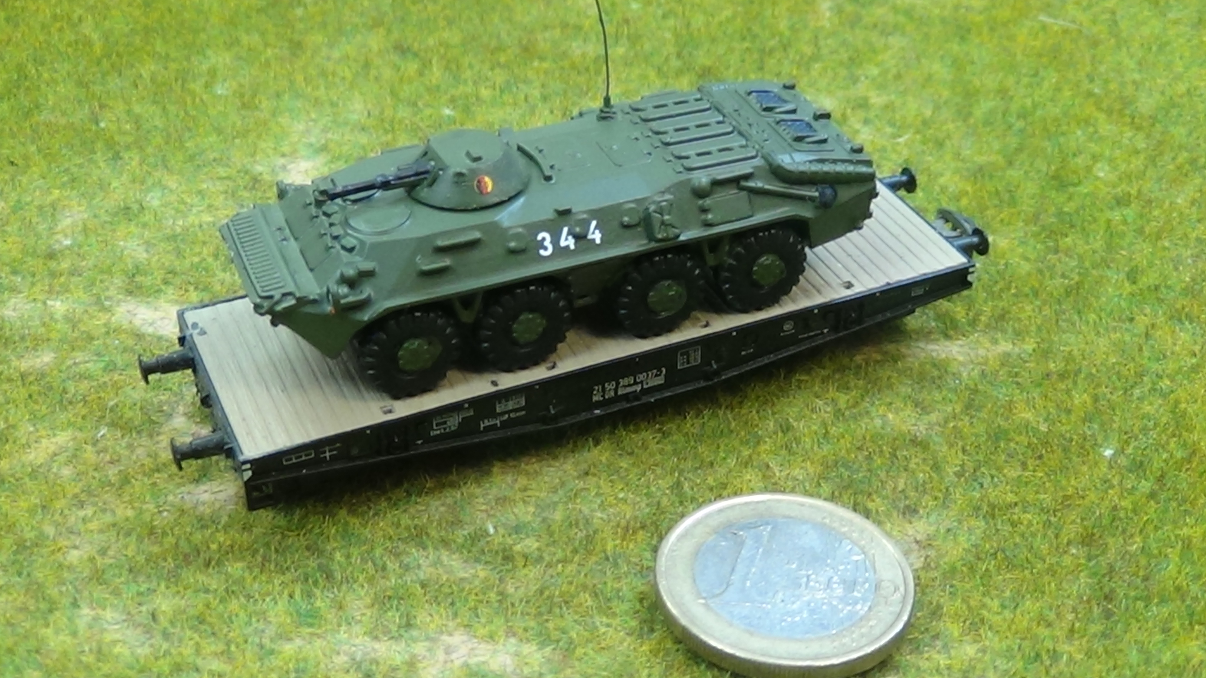 Modell eines Spz. BMP - 2 auf einem TT - Waggon fotografiert. Messingätzteile wurden verarbeitet : ( Lampenschützer, Spaten, 2 Abschleppseile, Antenne, Planennachbildung.