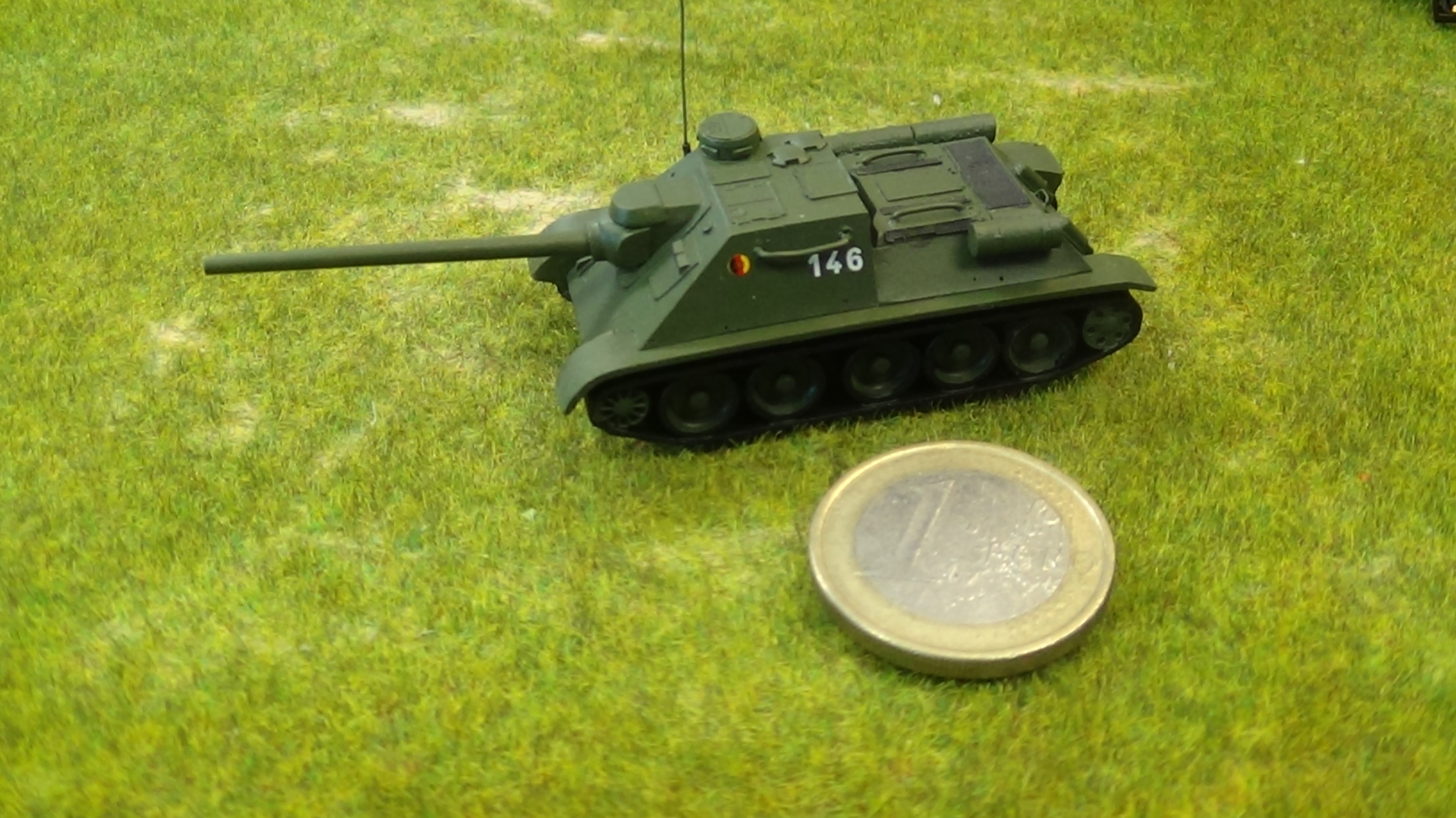 Selbstgestaltetes Modell einer SU 100 aus den Anfangsjahren der KVP und NVA im Maßstab 1/120. Zur Demonstration neben einem Euro fotografiert.