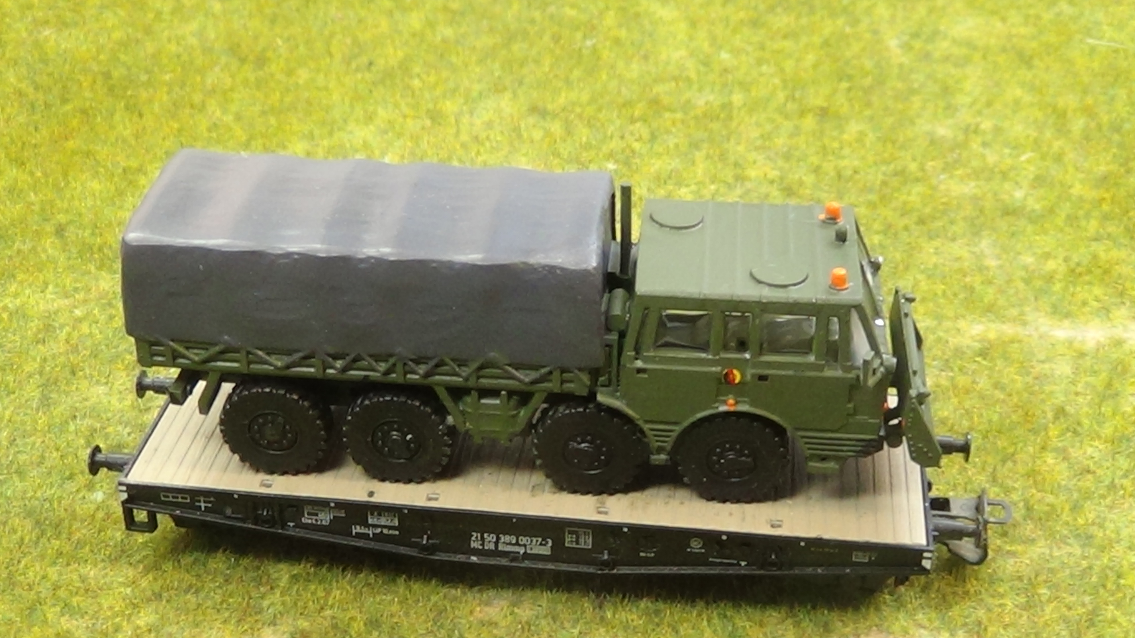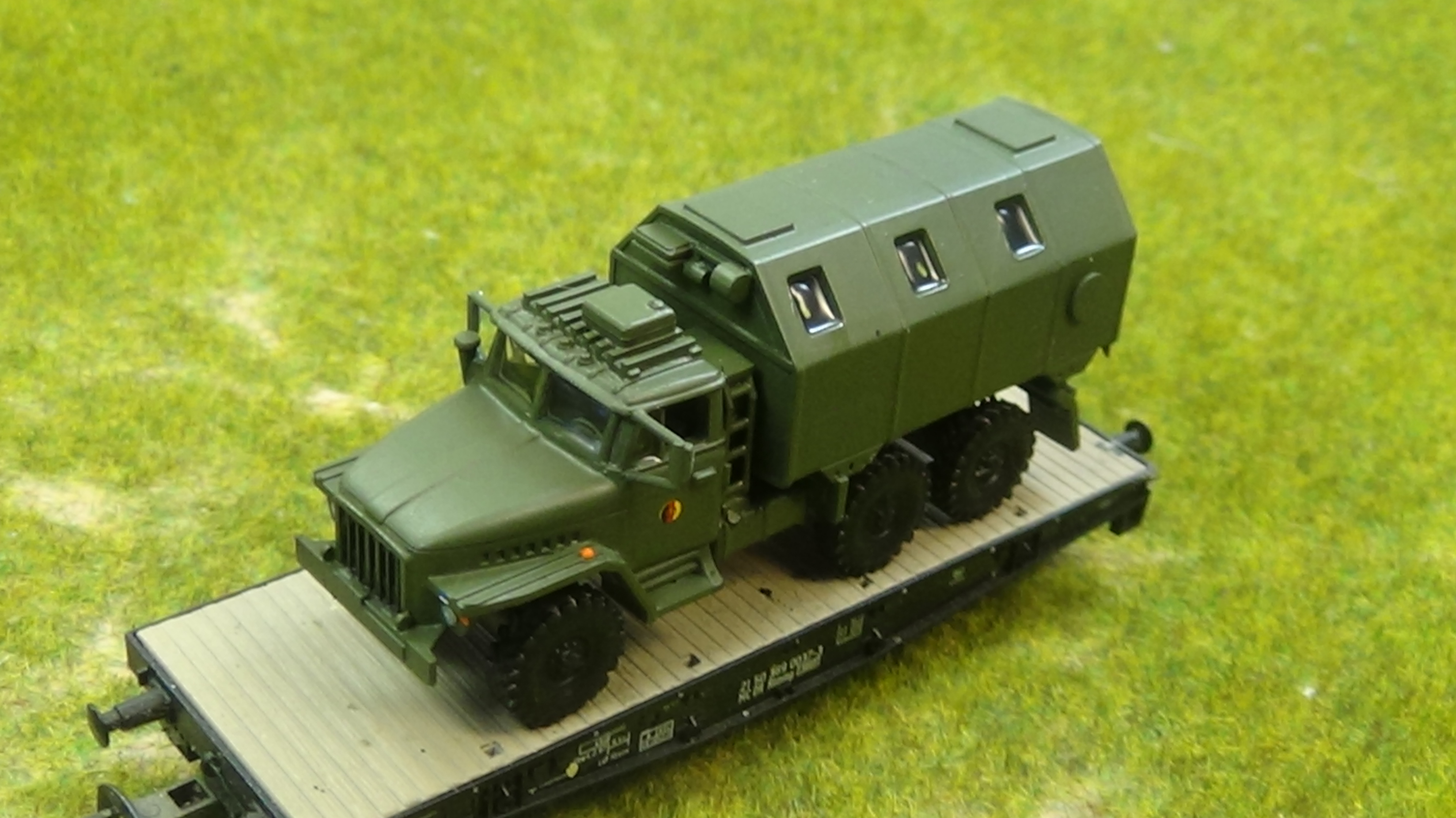 GaZ 66 im Maßstab 1/120, TT in NVA Ausführung auf einem TT Waggon zur demonstration fotografiert.