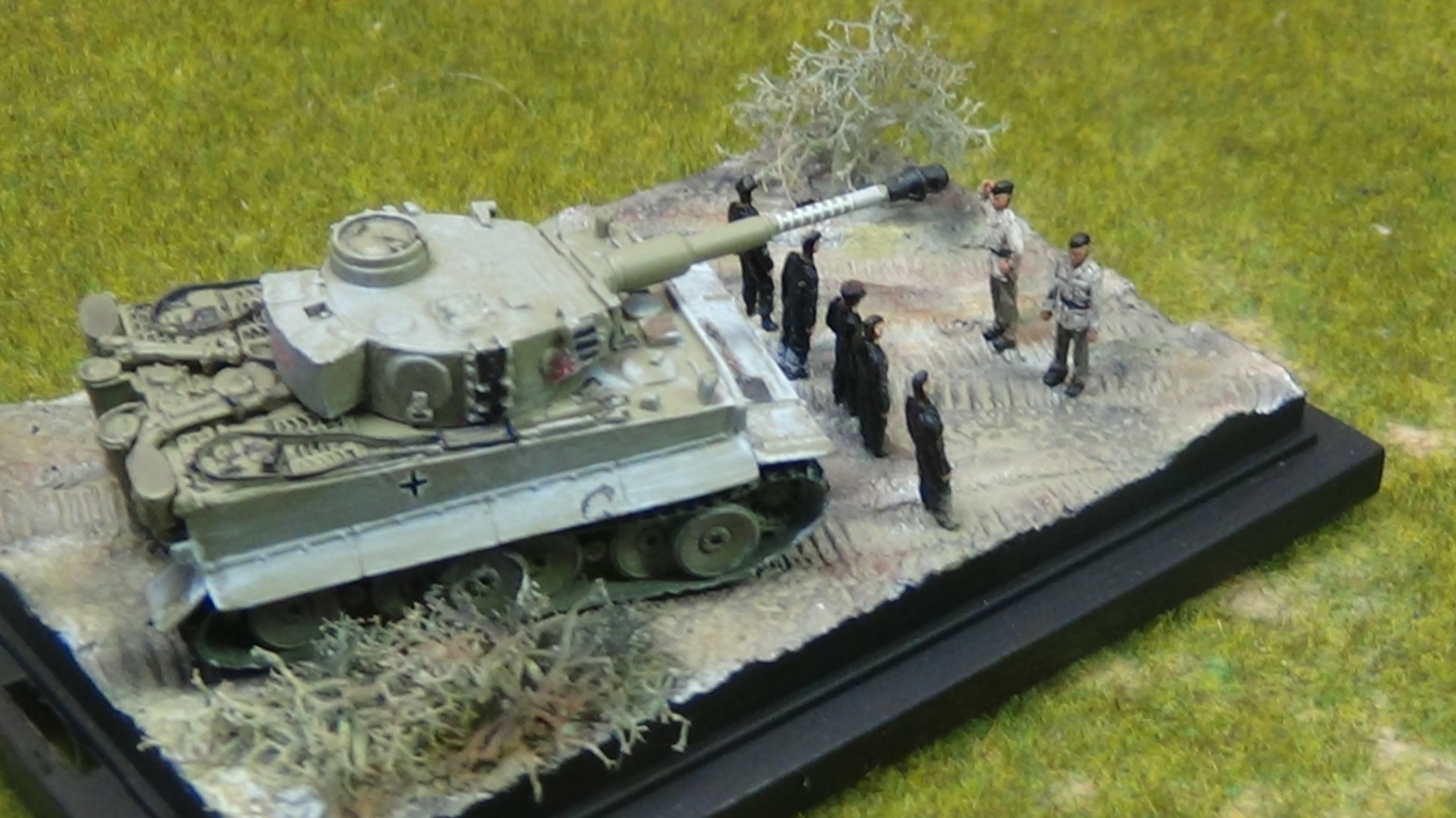 Selbstgestaltetes Diorama mit Tiger 1 M. Wittmann + 7 Soldaten ( 2 davon von Metaltroop ). Plexiglashaube ist auch dabei.